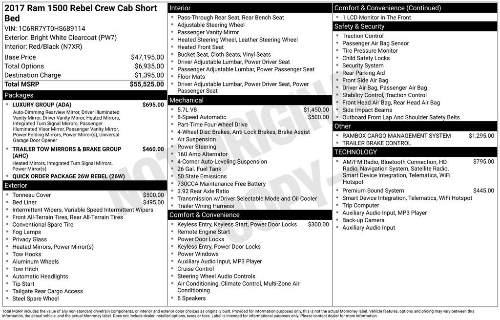 Bright White Clearcoat 2017 Ram 1500 Rebel Certified. Clean CARFAX. Odometer is 18162 miles below market average! New Feature, Auto-Dimming Exterior Mirrors, Auto-Dimming Rear-View Mirror, Dual Rear Exhaust w/Bright Tips, Exterior Mirrors Courtesy Lamps, Exterior Mirrors w/Supplemental Signals, Flat Black 5.7L Hemi Badge, Flat Black Ram 1500 Badge, Glove Box Lamp, LED Bed Lighting, Luxury Group, Overhead Console w/Garage Door Opener, Power Heated Fold-Away Mirrors, Power-Folding Mirrors, Quick Order Package 26W Rebel, Ram Glove Box Badge, Rear Dome w/On/Off Switch Lamp, Sun Visors w/Illuminated Vanity Mirrors, Underhood Lamp, Universal Garage Door Opener. Remember Rouen He'll Deal