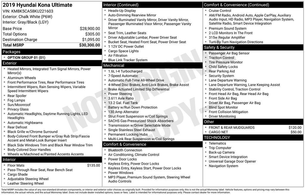 2019 Hyundai Kona Ultimate 1.6L I4 DGI 7-Speed Automatic AWD Sport Utility 26/29 City/Highway MPG