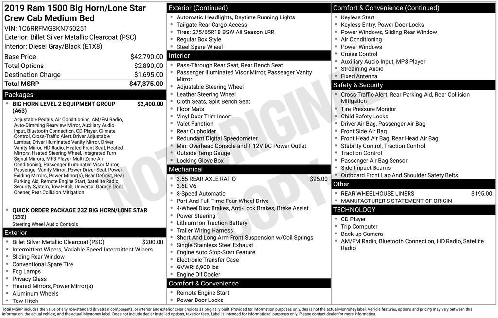 Billet Silver Metallic Clearcoat 2019 Ram 1500 Big Horn/Lone Star Recent Arrival! Certified. Clean CARFAX. Priced below KBB Fair Purchase Price! Odometer is 29401 miles below market average! Heated Seats, Touchscreen Controls, Backup Camera, Keyless Access with Push Button Start, Automatic Headlights, Voice Recognition, Bluetooth® Hands-Free, Running Boards, Remote start, Aluminum Wheels, Bed liner, 115V Auxiliary Power Outlet, 115V Auxiliary Rear Power Outlet, 2 USB Full Function/Charge Only Media Hub, 400W Inverter, 48V Belt Starter Generator, 8.4 Touchscreen Display, Air Conditioning ATC w/Dual Zone Control, Auto-Dimming Rear-View Mirror, Big Horn IP Badge, Big Horn Level 2 Equipment Group, Class IV Receiver Hitch, Cluster 7.0 TFT Color Display, Dampened Tailgate, Foam Bottle Insert (Door Trim Panel), Glove Box Lamp, Heated Front Seats, Heated Steering Wheel, Integrated Center Stack Radio, ParkSense Front/Rear Park Assist w/Stop, Power 4-Way Driver Lumbar Adjust, Power 8-Way Driver Seat, Power Adjustable Pedals, Power Heated Fold Away Mirrors, Quick Order Package 23Z Big Horn/Lone Star, Radio: Uconnect 4 w/8.4 Display, Rear Dome w/On/Off Switch Lamp, Rear Power Sliding Window, Rear Window Defroster, Remote Start System, Security Alarm, Single Disc Remote CD Player, SiriusXM Satellite Radio, Steering Wheel Mounted Audio Controls, Sun Visors w/Illuminated Vanity Mirrors, Universal Garage Door Opener. Remember Rouen He'll Deal