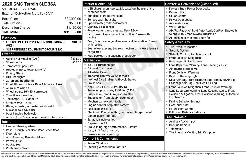 2020 GMC Terrain SLE 1.5L DOHC 9-Speed Automatic AWD Sport Utility 25/28 City/Highway MPG