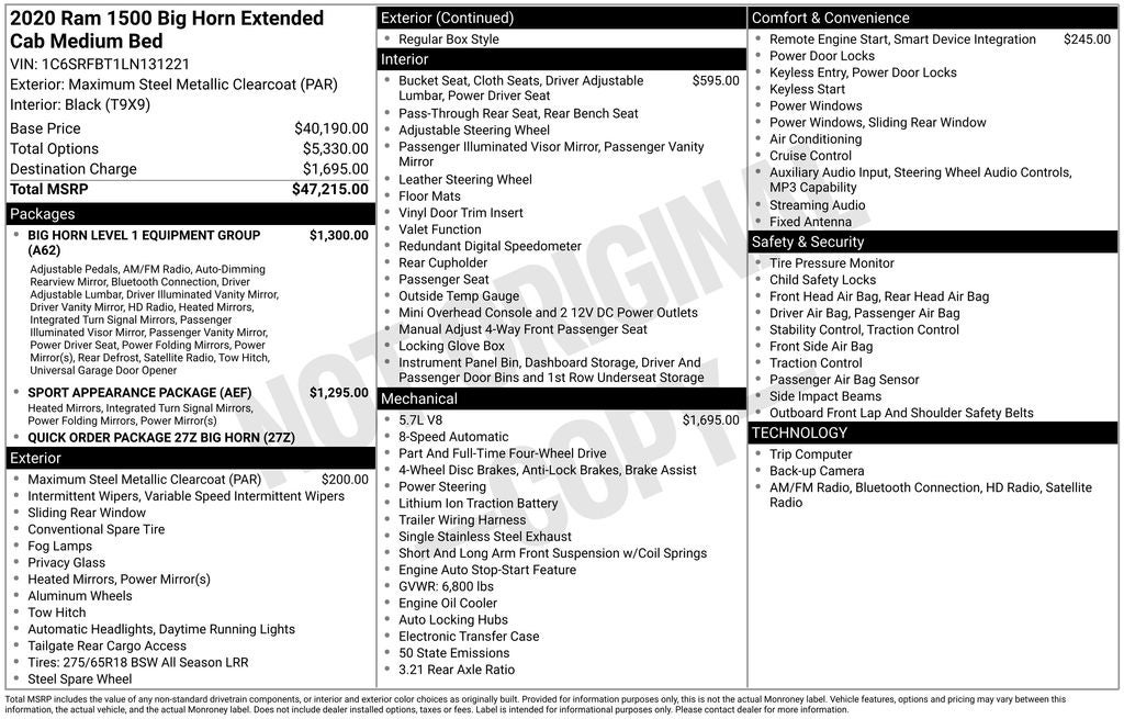 Maximum Steel Metallic Clearcoat 2020 Ram 1500 Big Horn/Lone Star Recent Arrival! Certified. 3 Rear Seat Head Restraints, 4 Way Front Headrests, Auto-Dimming Rear-View Mirror, Big Horn IP Badge, Big Horn Level 1 Equipment Group, Black Interior Accents, Black Premium Power Mirrors, Body Color Door Handles, Body Color Front Bumper, Body Color Premium Power Mirrors, Body Color Rear Bumper w/Step Pads, Bucket Seats, Class IV Receiver Hitch, Cluster 3.5 TFT Color Display, Deluxe Cloth Bucket Seats, Foam Bottle Insert (Door Trim Panel), Front Seat Back Map Pockets, Full Length Floor Console, Glove Box Lamp, Grille Surround 1 Body Color Texture 2 Black, Manual Adjust 4-Way Front Passenger Seat, Power 4-Way Driver Lumbar Adjust, Power 8-Way Driver Seat, Power Adjustable Pedals, Radio: Uconnect 4 w/8.4 Display, Rear 60/40 Folding Seat, Rear Dome w/On/Off Switch Lamp, Rear Power Sliding Window, Rear Window Defroster, SiriusXM Satellite Radio, Sport Appearance Package, Sport Decal, Sun Visors w/Illuminated Vanity Mirrors, Universal Garage Door Opener. Remember Rouen He'll Deal