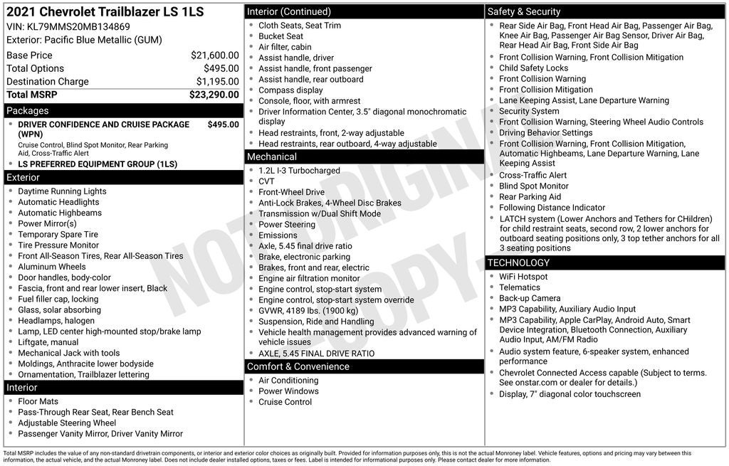 2021 Chevrolet TrailBlazer LS 1.2L Ecotec Turbo DOHC DI w/VVT CVT FWD Sport Utility 28/31 City/Highway MPG