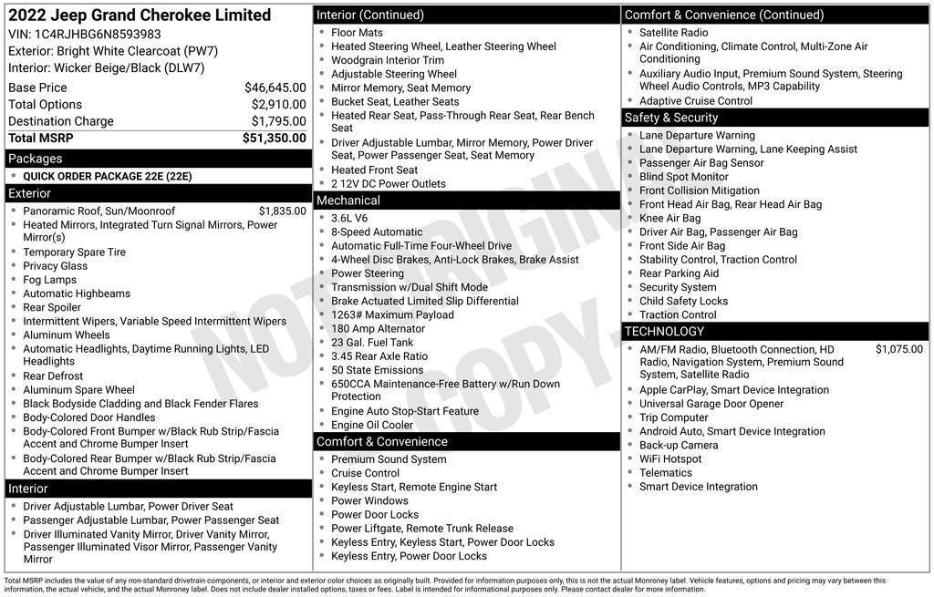 2022 Jeep Grand Cherokee Limited 3.6L V6 24V VVT 8-Speed Automatic 4WD Sport Utility 19/26 City/Highway MPG
