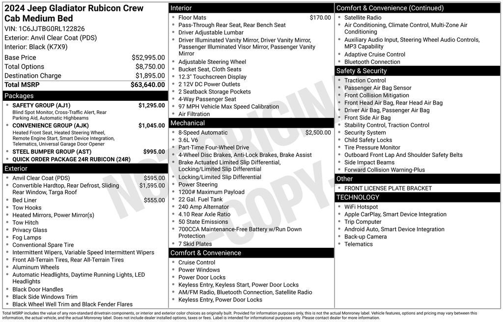 Anvil Clear Coat 2024 Jeep Gladiator Rubicon CARFAX One-Owner. Clean CARFAX. Auto High Beam Headlamp Control, Blind Spot & Cross Path Detection, Convenience Group, Emergency/Assistance Call, Heated Front Seats, Heated Steering Wheel, ParkSense Rear Park Assist System, Quick Order Package 24R Rubicon, Remote Start System, Safety Group, SiriusXM Radio Service, SiriusXM w/360L, Steel Bumper Group, Steel Front Bumper, Universal Garage Door Opener. Remember Rouen He'll Deal