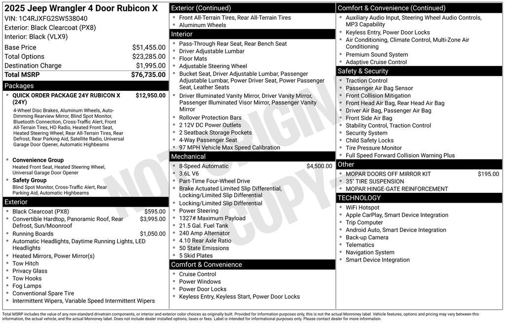 Black Clearcoat 2025 Jeep Wrangler Rubicon X Recent Arrival! CARFAX One-Owner. Clean CARFAX. 12.3 Touchscreen Display, 35 Tire Suspension, 4.56 Rear Axle Ratio, 4G LTE Wi-Fi Hot Spot, 97 MPH Vehicle Max Speed Calibration, Acoustic Front Seat Area Carpet, Acoustic Laminated Front Door Glass, Alpine Premium Audio System, Anti-Lock 4-Wheel Disc Perf Brakes, Apple CarPlay, Auto High Beam Headlamp Control, Auto-Dimming Rear-View Mirror, Blind Spot & Cross Path Detection, Body Color 3-Piece Hard Top, Body Color Rubicon Highline Flare, Connected Travel & Traffic Services, Connectivity - US/Canada, Convenience Group, Freedom Panel Storage Bag, Google Android Auto, GPS Navigation, HD Radio, Heated Front Seats, Heated Steering Wheel, Integrated Off-Road Camera, Integrated Voice Command w/Bluetooth®, Leather Wrapped Park Brake Handle, Leather Wrapped Shift Knob, MOPAR Hardtop Headliner, MOPAR Hinge-Gate Reinforcement, Nappa Leather Seats, ParkSense Rear Park Assist System, Power 4-Way Driver Lumbar Adjust, Power 4-Way Passenger Lumbar Adjust, Power Adjust 8-Way Driver Seat, Power Adjust 8-Way Front Passenger Seat, Premium Door Trim Panel, Quick Order Package 24Y Rubicon X, Radio: Uconnect 5 Nav w/12.3 Display, Rear Window Defroster, Rear Window Wiper/Washer, Safety Group, SiriusXM Radio Service, SiriusXM w/360L, Steel Front Bumper, Steel Rear Bumper, Technology Group, Trailer Tow Prep Package, Universal Garage Door Opener, Wheels: 17 x 8 Machined w/Black Pockets, Xtreme 35 Tire Package. Remember Rouen He'll Deal